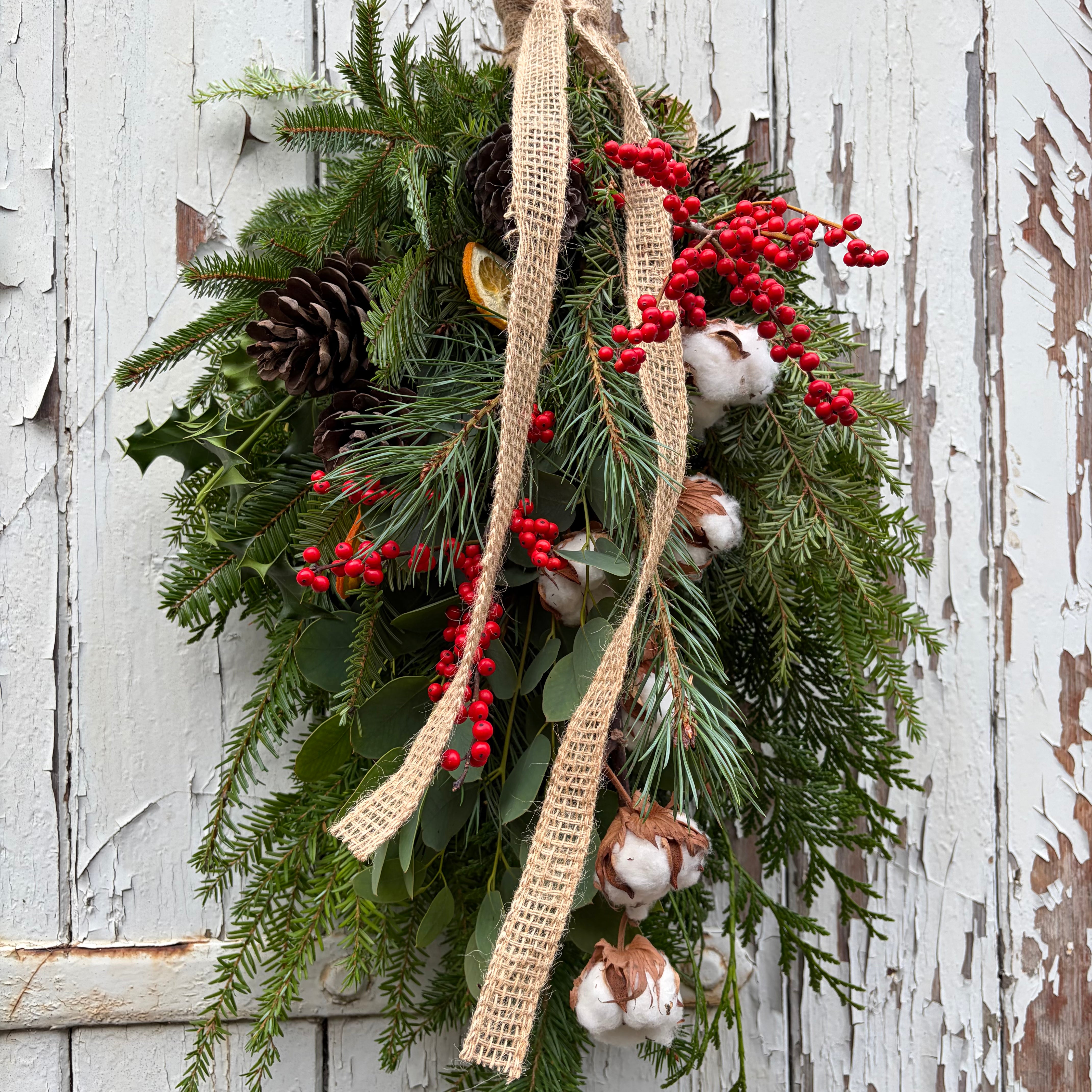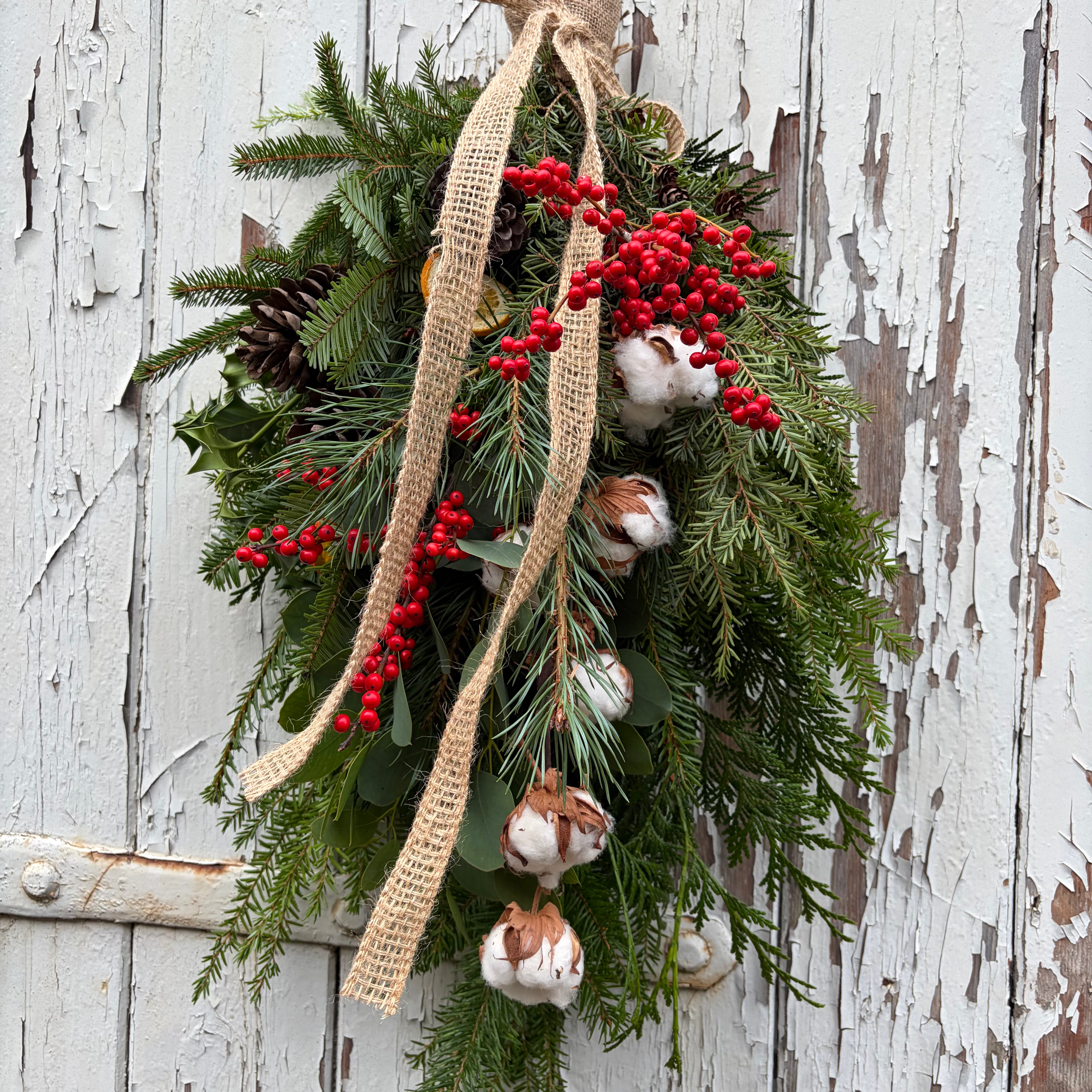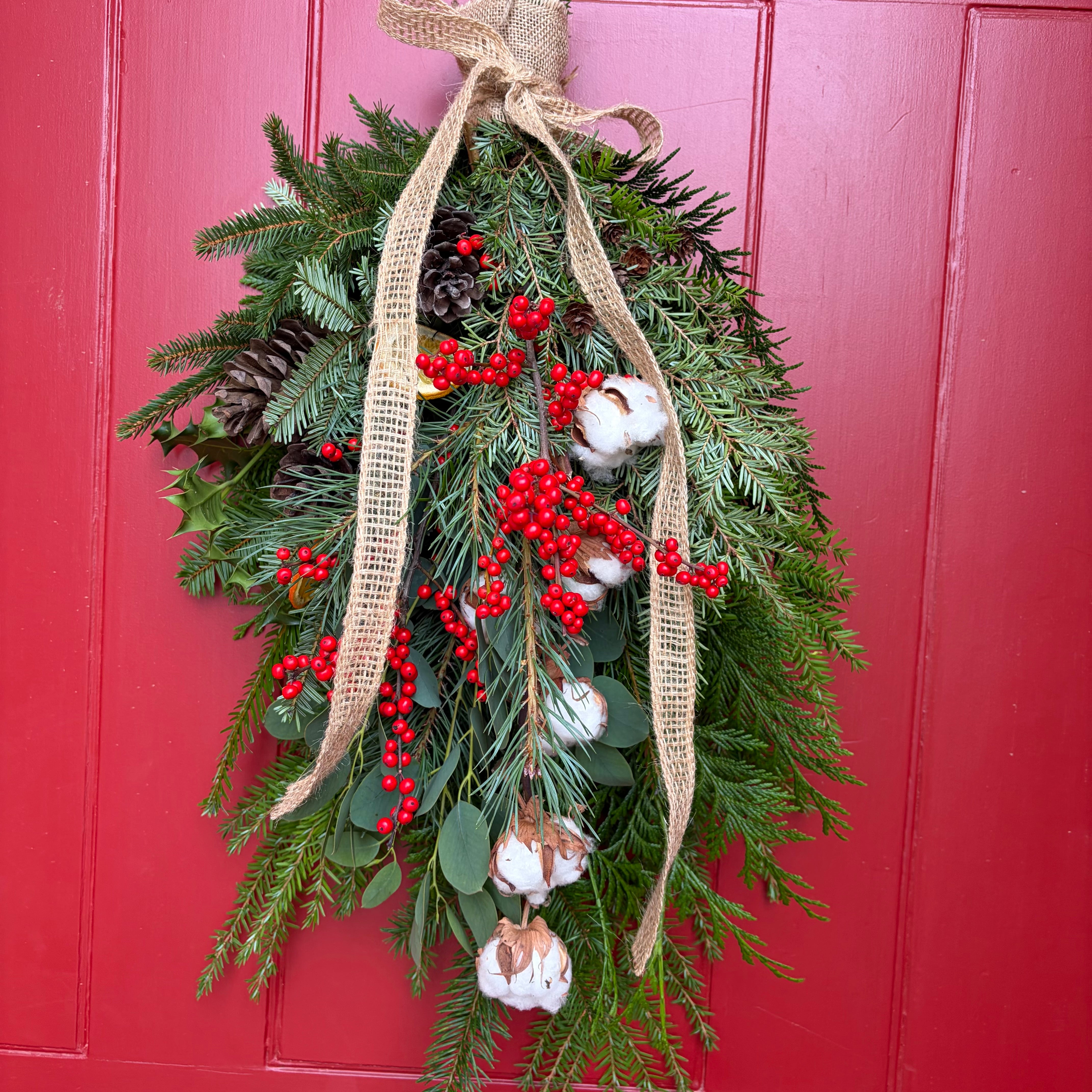 If a Christmas wreath isn’t for you we have designed this beautiful swag. Lush winter textured foliage, scented eucalyptus, rich red ilex berries, dried orange slices, cotton, pine cones tied with a hessian bow.