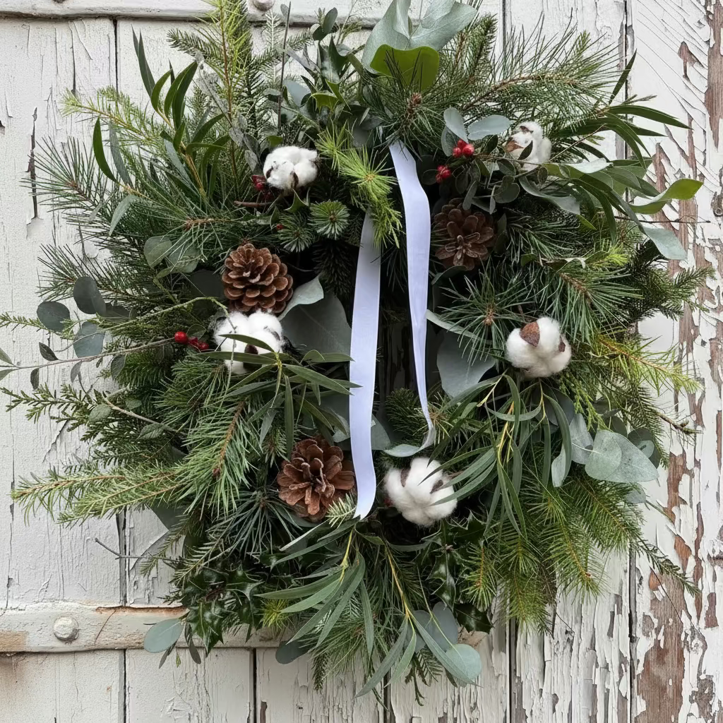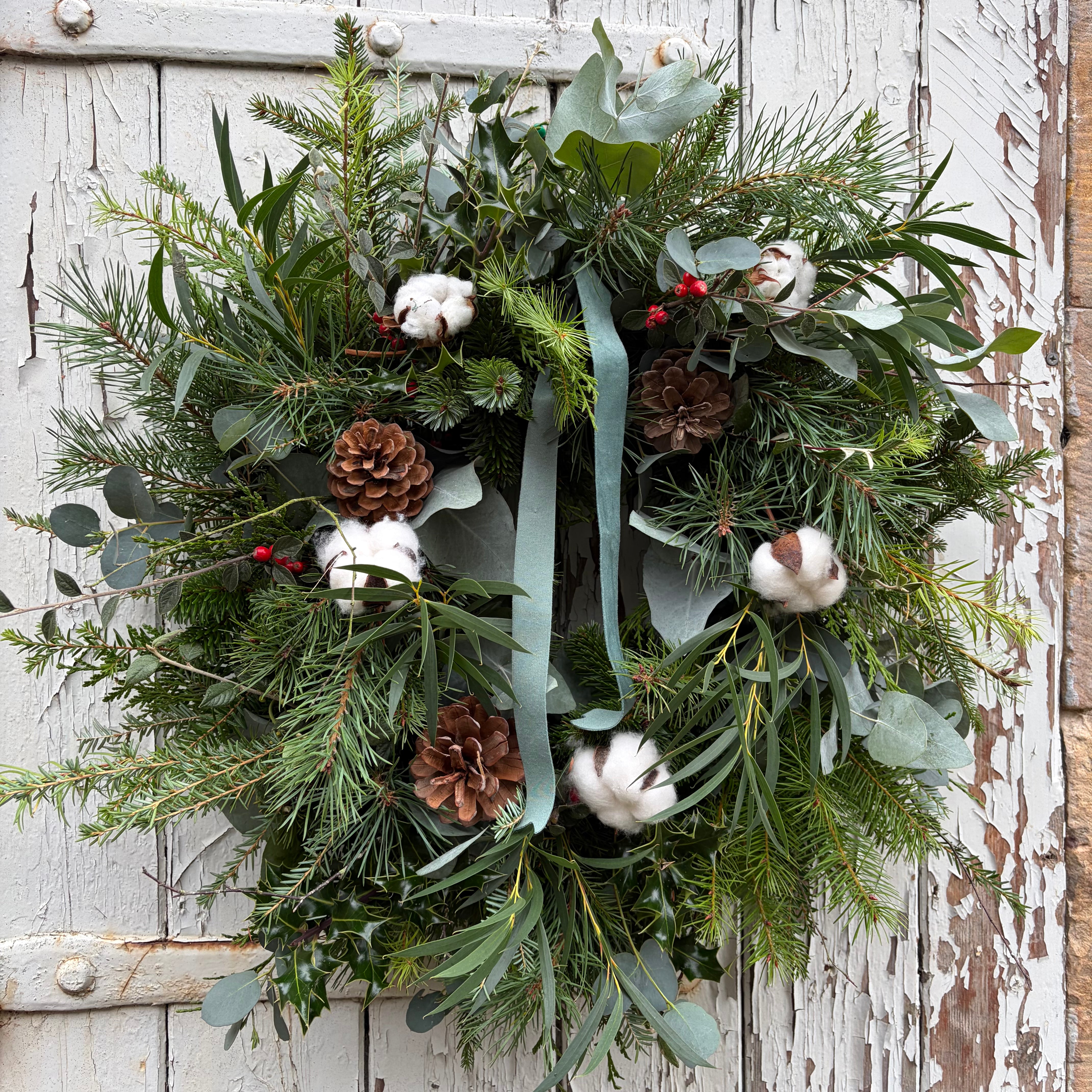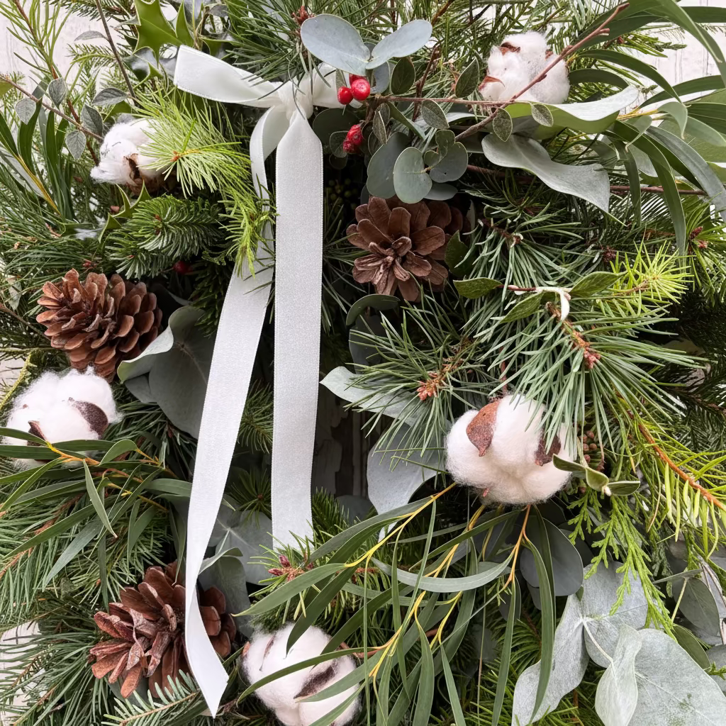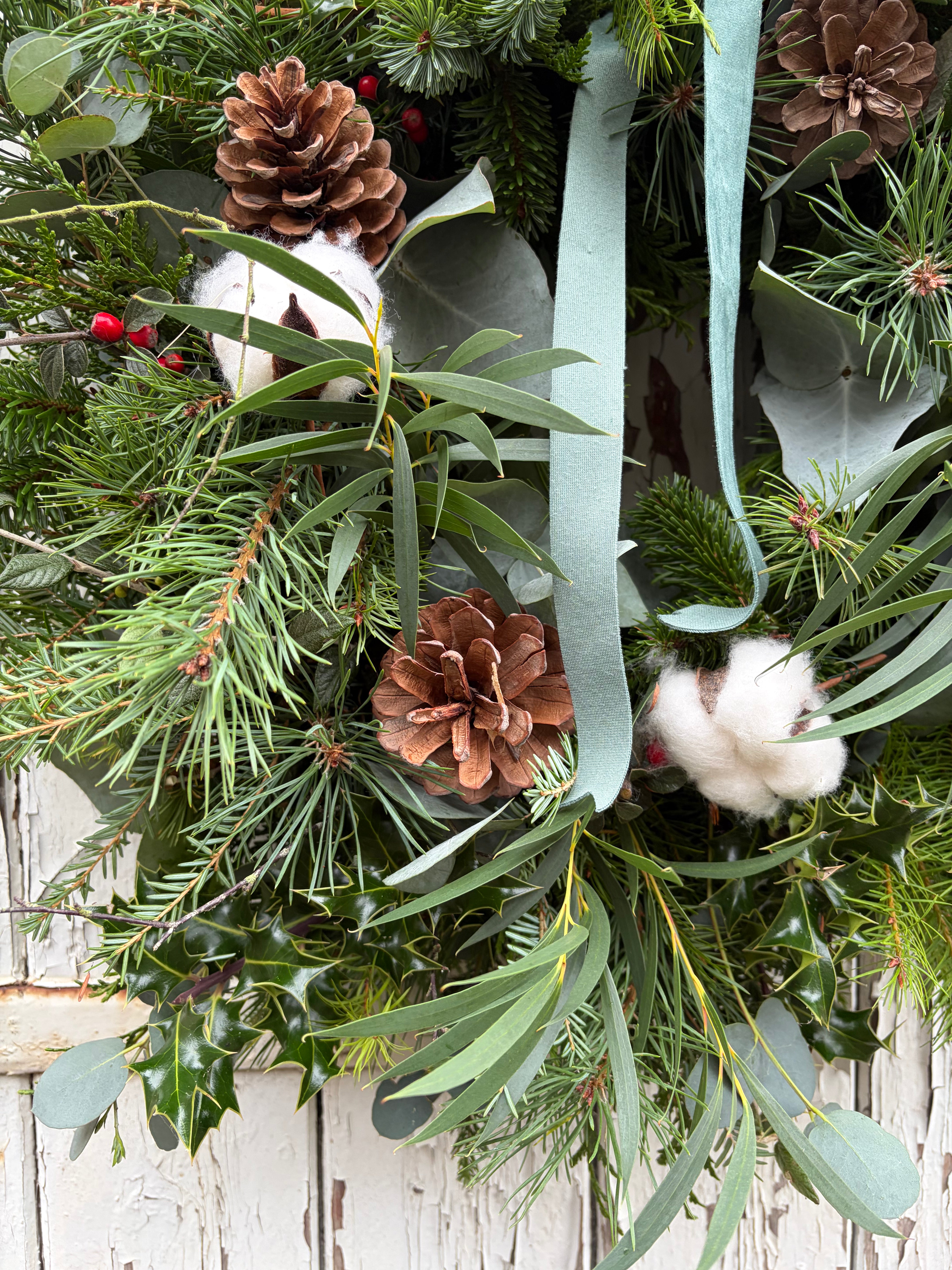 If you’re looking for something a little understated for your door this year then this wreath is for you. Our moss base wreaths included lots of winter foliage, scented eucalyptus, pine cones, a few pops of white cotton along with white satin gorgeous ribbon.
